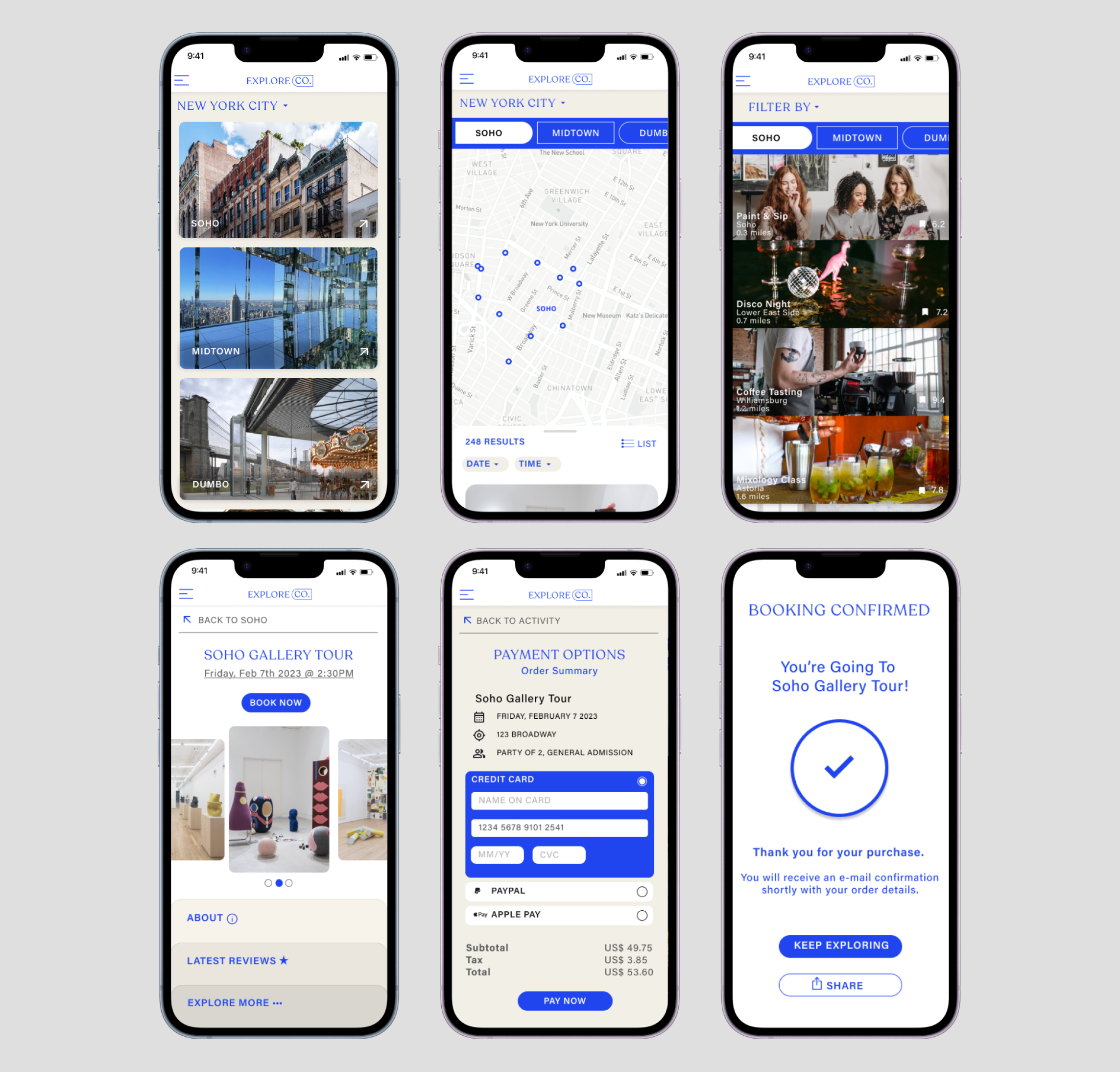Explore Co. is a mobile app concept that enables users to discover and book activities in their neighborhood. The app aims to solve the problem of the overwhelming number of choices one can face when trying to make the most of their free time in a bustling city like New York. With endless activity options available, it can be challenging to decide on what to do. Explore Co. simplifies the process by curating a list of activities based on the user's location. The final design is both clean and editorial, as well as humanist and user friendly.