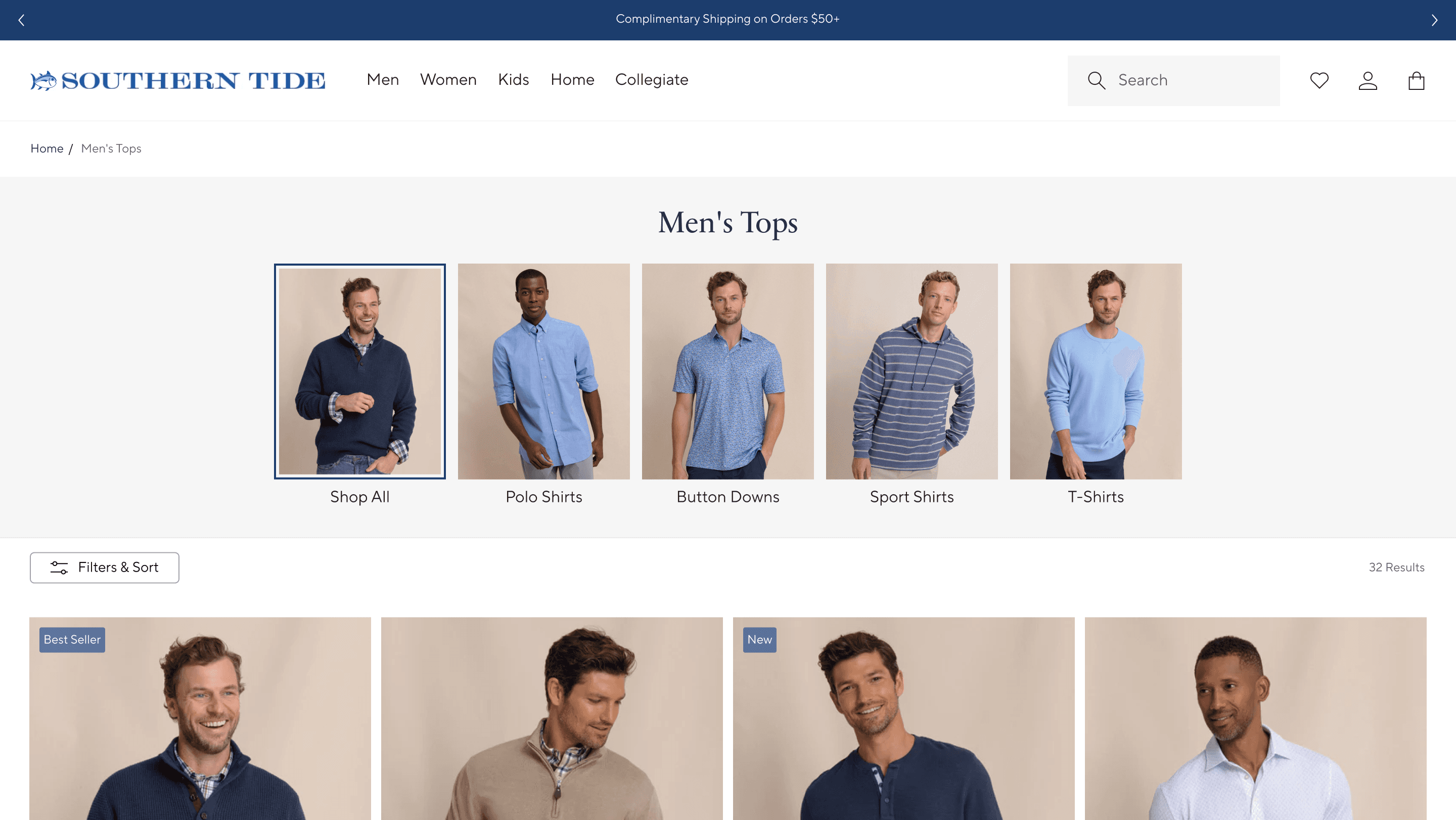 Southern Tide's assortment is wide (with category, the range of styles, fits, and fabrications) can overwhelm. I introduced a subcategory image navigation at the top of each PLP, giving shoppers a visual entry point to refine before they even hit the grid. Less scrolling, less friction, faster path to what's relevant.