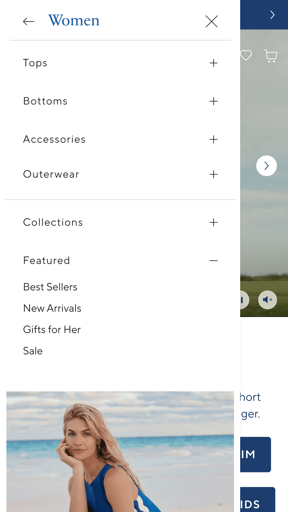 Southern Tide's catalog spans multiple categories, collections, and lifestyle moments. I designed a mega menu that balances functional hierarchy with editorial intent, organized category links paired with a featured collection image that merchandises the brand while guiding the shopper. On mobile, the same structure collapses into a focused accordion that keeps navigation fast without losing depth.